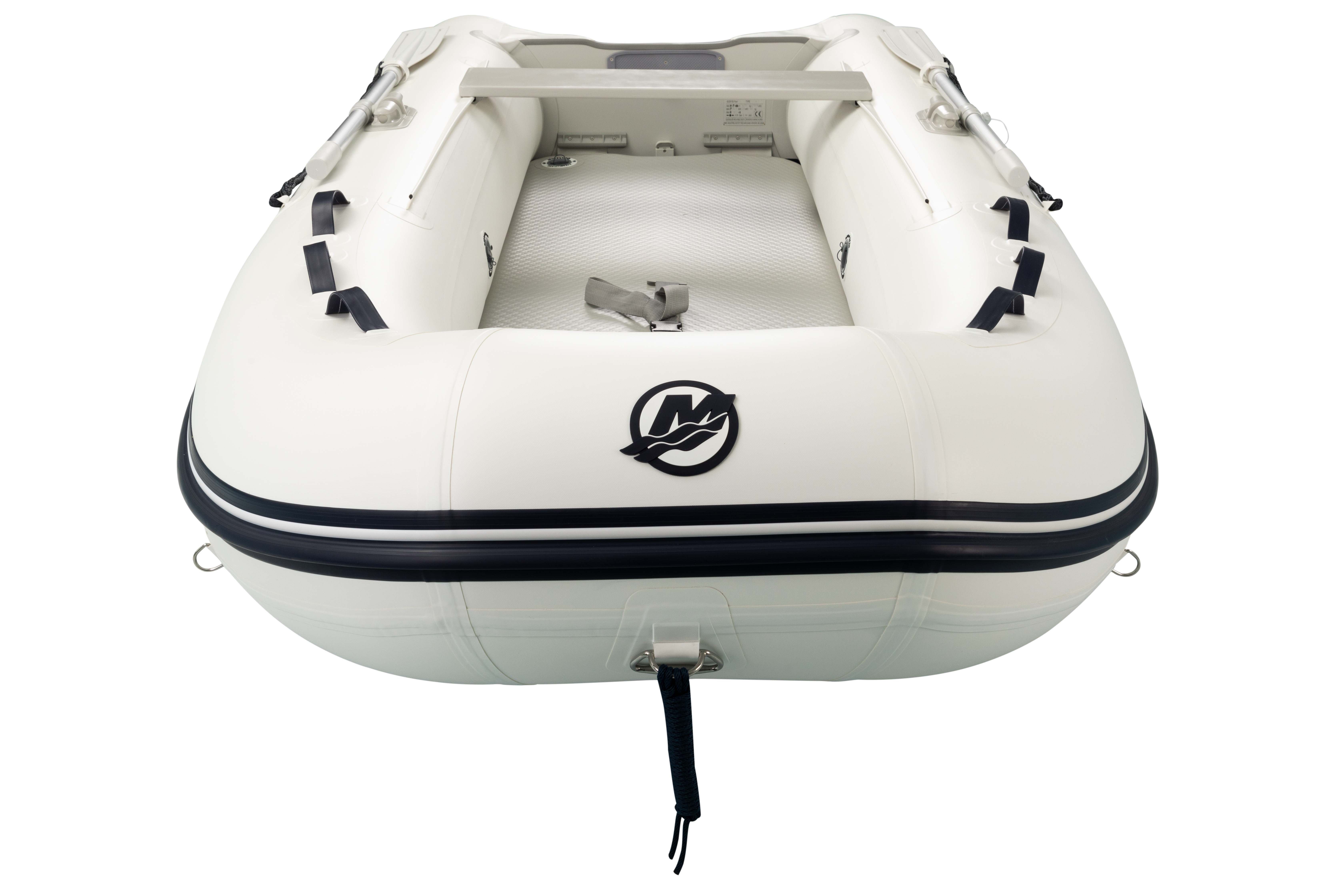 Her får du en luksus gummibåd, der både egner sig til hygge og leg på vandet, og til at have med på en større båd. Udarbejdet i robust hvid PVC med kraftig blå Quicksilver markering.