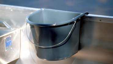 Blå rælingsspand med hank til at hænge på rælingen, udvendigt eller indvendigt.